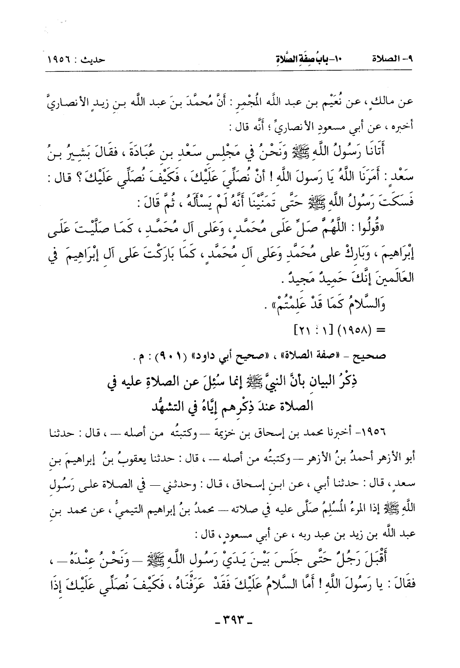 1956 - أَخْبَرَنَا مُحَمَّدُ بْنُ إِسْحَاقَ بْنِ خُزَيْمَةَ ـ وكتبتُه مِنْ أَصْلِهِ ـ قَالَ: حَدَّثَنَا أَبُو الْأَزْهَرِ أَحْمَدُ بْنُ الْأَزْهَرِ وَكَتَبْتُهُ مِنْ أَصْلِهِ قَالَ: حَدَّثَنَا يَعْقُوبُ بْنُ إِبْرَاهِيمَ بْنِ سَعْدٍ قَالَ: حَدَّثَنَا أَبِي عَنِ ابْنِ إِسْحَاقَ قَالَ: وَحَدَّثَنِي - فِي الصَّلَاةِ عَلَى رَسُولِ اللَّهِ صَلَّى اللَّهُ عَلَيْهِ وَسَلَّمَ إِذَا الْمَرْءُ الْمُسْلِمُ صَلَّى عَلَيْهِ فِي صَلَاتِهِ - مُحَمَّدُ بْنُ إِبْرَاهِيمَ التَّيْمِيُّ عَنْ مُحَمَّدِ بْنِ عَبْدِ اللَّهِ بْنِ زَيْدِ بْنِ عَبْدِ رَبِّهِ عَنْ أَبِي مَسْعُودٍ قَالَ: