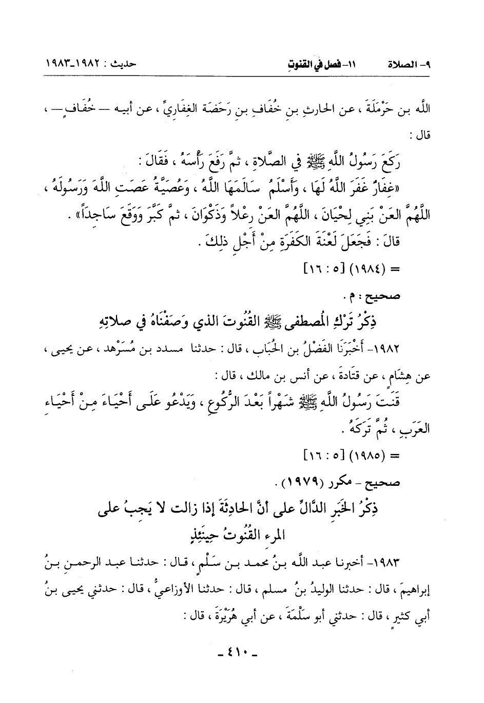 -[411]- قَنَتَ رَسُولُ اللَّهِ صَلَّى اللَّهُ عَلَيْهِ وَسَلَّمَ فِي صَلَاةِ الْعَتَمَةِ شَهْرًا يَقُولُ فِي قُنُوتِهِ: