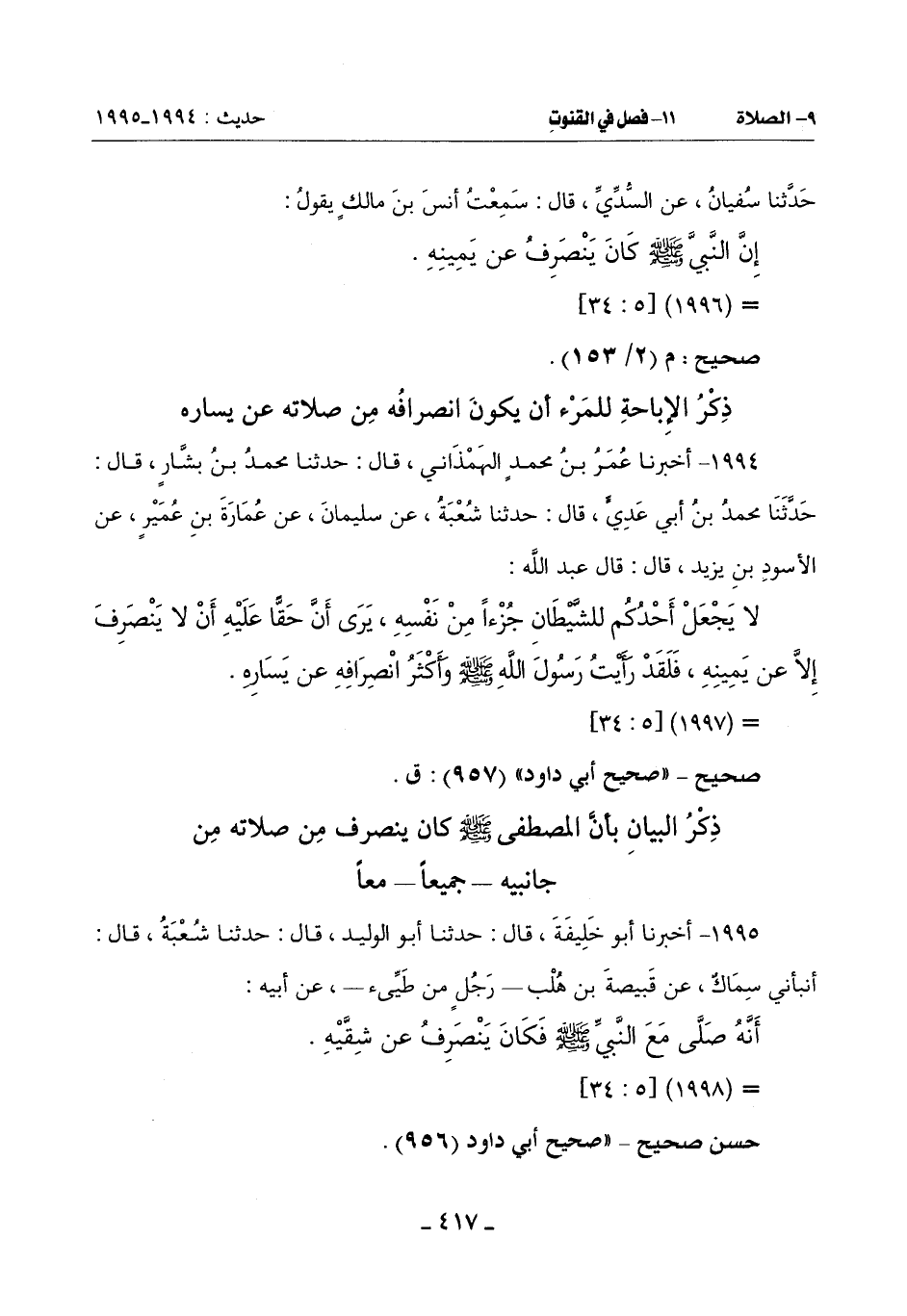 ذِكْرُ الْبَيَانِ بِأَنَّ الْمُصْطَفَى صَلَّى اللَّهُ عَلَيْهِ وَسَلَّمَ كَانَ يَنْصَرِفُ مِنْ صَلَاتِهِ مِنْ جَانِبَيْهِ جميعاً معاً