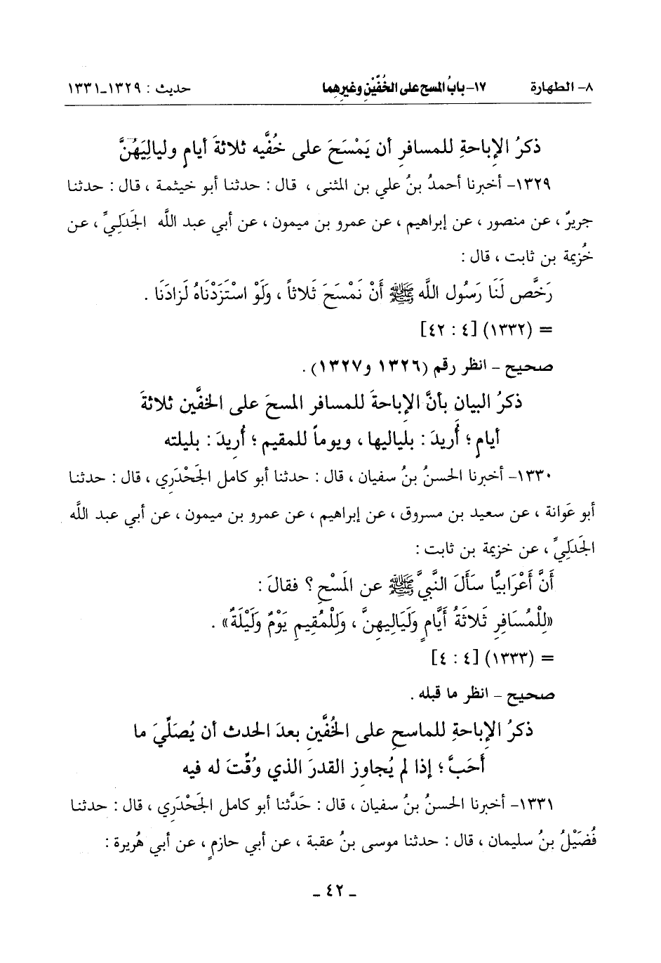 1330 - أَخْبَرَنَا الْحَسَنُ بْنُ سُفْيَانَ قَالَ: حَدَّثَنَا أَبُو كَامِلٍ الْجَحْدَرِيُّ قَالَ: حَدَّثَنَا أَبُو عَوَانَةَ عَنْ سَعِيدِ بْنِ مَسْرُوقٍ عَنْ إِبْرَاهِيمَ عَنْ عَمْرِو بْنِ مَيْمُونٍ عَنْ أَبِي عَبْدِ اللَّهِ الْجَدَلِيِّ عَنْ خُزَيْمَةَ بْنِ ثَابِتٍ