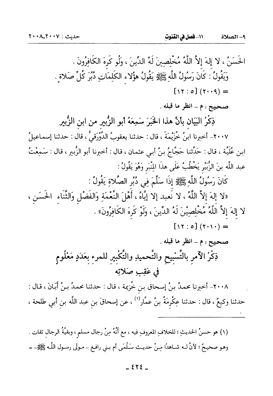 2007 - أَخْبَرَنَا ابْنُ خُزَيْمَةَ قَالَ: حَدَّثَنَا يَعْقُوبُ الدَّوْرَقِيُّ قَالَ: حَدَّثَنَا إِسْمَاعِيلُ بْنُ عُلَيَّةَ قَالَ: حَدَّثَنَا حَجَّاجُ بْنُ أَبِي عُثْمَانَ قَالَ: أَخْبَرَنَا أَبُو الزُّبَيْرِ قَالَ: سَمِعْتُ عَبْدَ اللَّهِ بْنَ الزُّبَيْرِ يَخْطُبُ عَلَى هَذَا الْمِنْبَرِ وَهُوَ يَقُولُ: