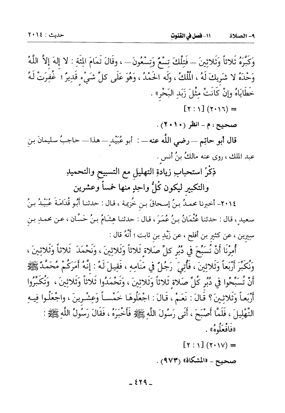 2014 - أَخْبَرَنَا مُحَمَّدُ بْنُ إِسْحَاقَ بْنِ خُزَيْمَةَ قَالَ: حَدَّثَنَا أَبُو قُدَامَةَ عُبَيْدُ اللَّهِ بْنُ سَعِيدٍ قَالَ: حَدَّثَنَا عُثْمَانُ بْنُ عُمَرَ قَالَ: حَدَّثَنَا هشام بن حسان عن محمد بن سيرين عَنْ كَثِيرِ بْنِ أَفْلَحَ: عَنْ زَيْدِ بْنِ ثَابِتٍ أَنَّهُ قَالَ: