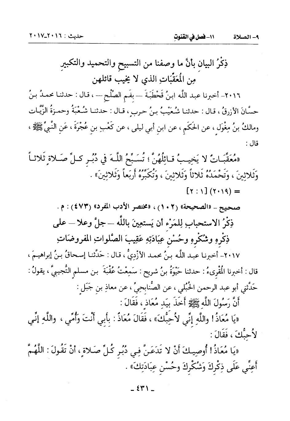 (يَا مُعَاذُ أُوصِيكَ أَنْ لَا تَدَعَنَّ فِي دُبُرِ كُلِّ صَلَاةٍ أَنْ تَقُولَ: اللَّهُمَّ أَعِنِّي عَلَى ذِكْرِكَ وَشُكْرِكَ وَحُسْنِ عِبَادَتِكَ) -[432]-