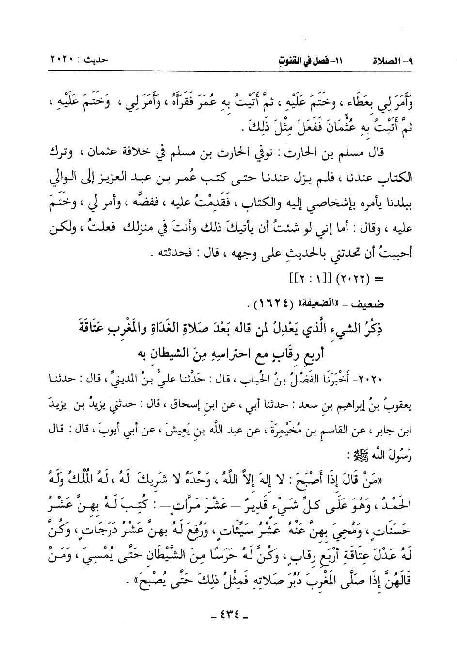 (من قَالَ إِذَا أَصْبَحَ: لَا إِلَهَ إِلَّا اللَّهُ وَحْدَهُ لَا شَرِيكَ لَهُ لَهُ الْمُلْكُ وَلَهُ الْحَمْدُ وَهُوَ عَلَى كُلِّ شَيْءٍ قَدِيرٌ عَشْرَ مَرَّاتٍ كُتِبَ لَهُ بِهِنَّ عَشْرُ حَسَنَاتٍ ومُحي بِهِنَّ عَنْهُ عَشْرُ سَيِّئَاتٍ ورُفع لَهُ بِهِنَّ عَشْرُ دَرَجَاتٍ وكُنَّ لَهُ عَدْلَ عِتاقة أَرْبَعِ رِقَابٍ وكُنَّ لَهُ حَرَسًا مِنَ الشَّيْطَانِ حَتَّى يُمْسِيَ وَمَنْ قَالَهُنَّ إِذَا صَلَّى الْمَغْرِبَ دُبُرَ صلاته فمثل ذلك حتى يُصبح) -[435]-