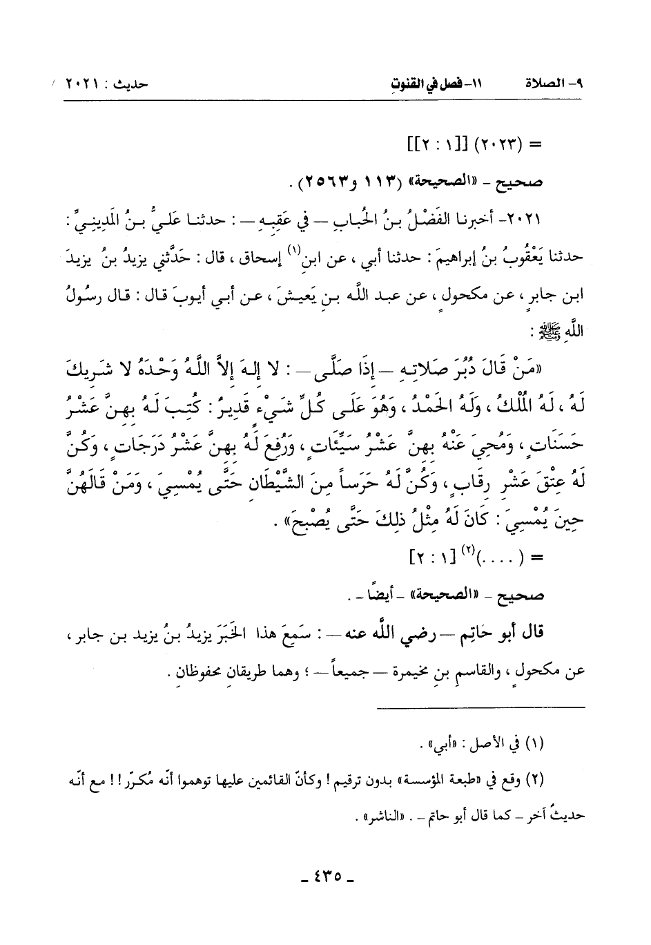 (¬2) وقع في ((طبعة المؤسسة)) بدون ترقيم! وكأن القائمين عليها توهموا أنه مُكرر!! مع أنه حديث آخر ـ كما قال أبو حاتم ـ. ((الناشر)).