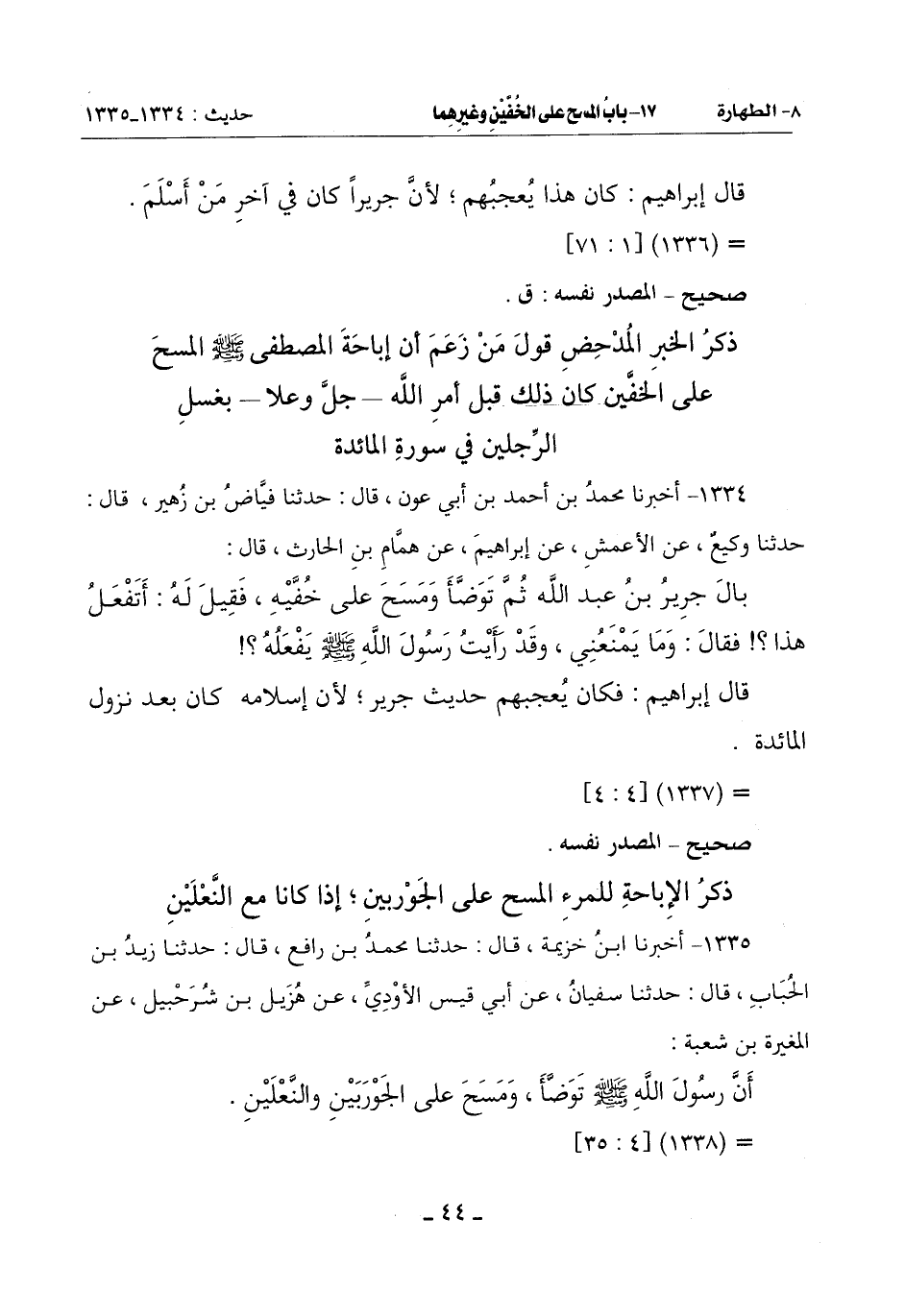 1335 - أَخْبَرَنَا ابْنُ خُزَيْمَةَ قَالَ: حَدَّثَنَا مُحَمَّدُ بْنُ رَافِعٍ قَالَ: حَدَّثَنَا زَيْدُ بْنُ الْحُبَابِ قَالَ: حَدَّثَنَا سُفْيَانُ عَنْ أَبِي قَيْسٍ الْأَوْدِيِّ عَنْ هُزَيْلِ بْنِ شُرَحْبِيلَ عَنِ الْمُغِيرَةِ بْنِ شُعْبَةَ