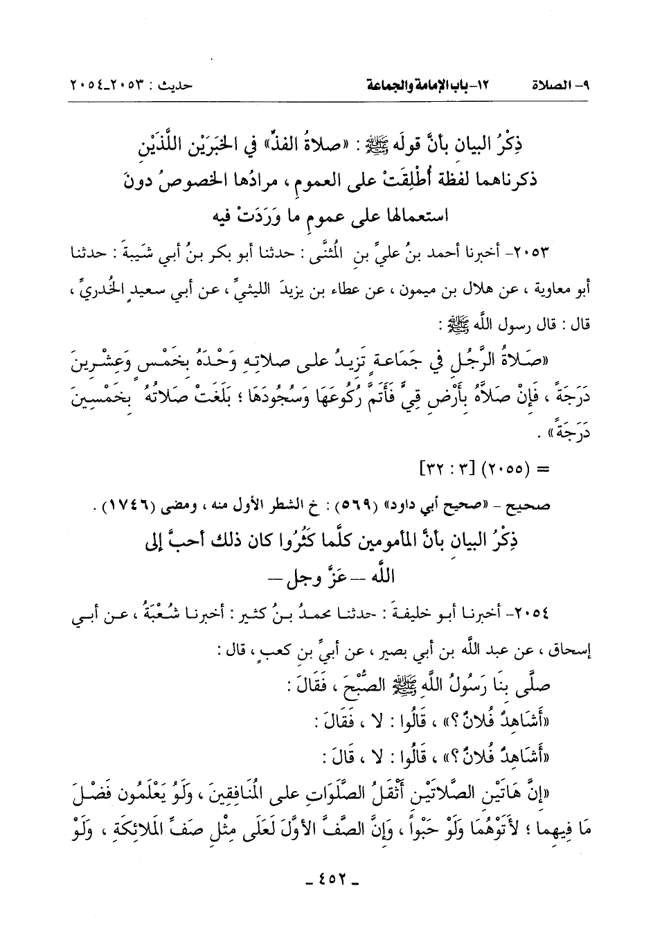 (إِنَّ هَاتَيْنِ الصَّلَاتَيْنِ أَثْقَلُ الصَّلَوَاتِ عَلَى الْمُنَافِقِينَ وَلَوْ يَعْلَمُونَ فَضْلَ مَا فِيهِمَا لَأَتَوْهُمَا وَلَوْ حَبْوًا وَإِنَّ الصَّفَّ الْأَوَّلَ لَعَلَى مِثْلِ صَفِّ الْمَلَائِكَةِ وَلَوْ -[453]- تَعْلَمُونَ فَضِيلَتَهُ لَابْتَدَرْتُمُوهُ وَصَلَاةُ الرَّجُلِ مَعَ الرَّجُلَيْنِ أَزْكَى مِنْ صَلَاتِهِ مَعَ رَجُلٍ وَكُلَّمَا كَثُرَ فَهُوَ أَحَبُّ إِلَى اللَّهِ)