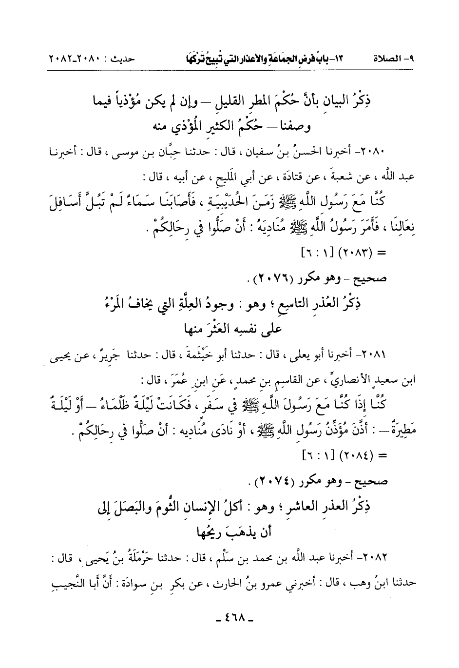 كُنَّا مَعَ رَسُولِ اللَّهِ صَلَّى اللَّهُ عَلَيْهِ وَسَلَّمَ زَمَنَ الْحُدَيْبِيَةِ فَأَصَابَنَا سَمَاءٌ لَمْ تَبُلَّ أَسَافِلَ نِعَالِنَا فَأَمَرَ رَسُولُ اللَّهِ صَلَّى اللَّهُ عَلَيْهِ وَسَلَّمَ مُنَادِيَهُ: أَنْ صَلُّوا في رحالكم