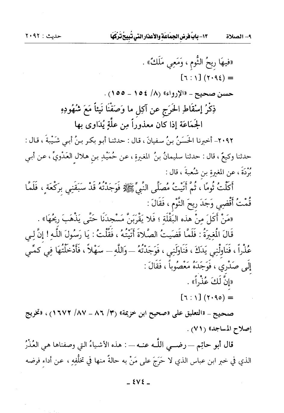 قَالَ أَبُو حَاتِمٍ رَضِيَ اللَّهُ عَنْهُ: هَذِهِ الْأَشْيَاءُ الَّتِي وَصَفْنَاهَا هِيَ الْعُذْرُ الَّذِي فِي خَبَرِ ابْنِ عَبَّاسٍ الَّذِي لَا حَرَجَ عَلَى مَنْ بِهِ حَالَةٌ مِنْهَا فِي تخلُّفِهِ عَنْ أَدَاءِ فَرْضِهِ -[475]- جَمَاعَةً وَعَلَيْهِ إِثْمُ تَرْكِ إِتْيَانِ الْجَمَاعَةِ لِأَنَّهُمَا فَرْضَانِ اثْنَانِ: الْجَمَاعَةُ وَأَدَاءُ الْفَرْضِ فمن أدى الفرض وهو يسمع النداء فقط سَقَطَ عَنْهُ فَرْضُ أَدَاءِ الصَّلَاةِ وَعَلَيْهِ إِثْمُ تَرْكِ إِتْيَانِ الْجَمَاعَةِ