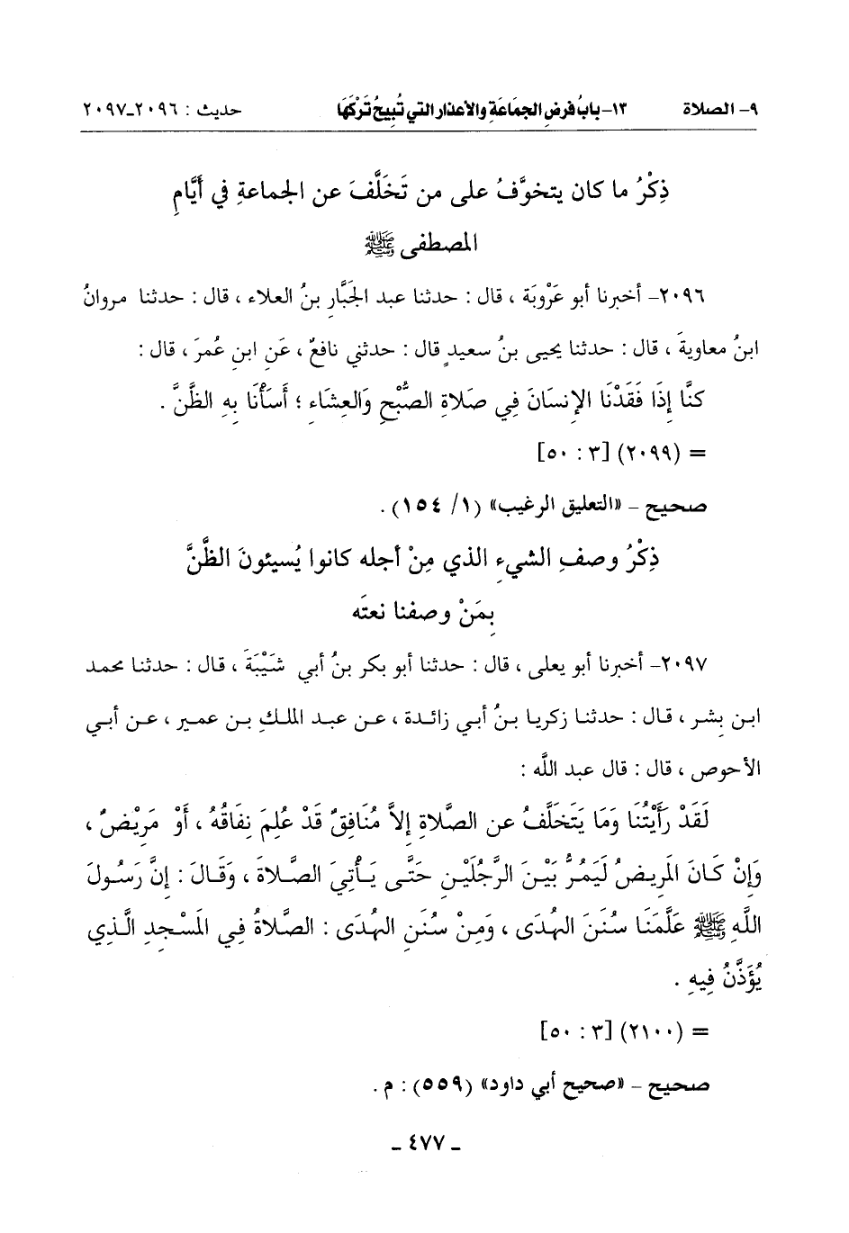 لَقَدْ رَأَيْتُنَا وَمَا يتخلَّف عَنِ الصَّلَاةِ إِلَّا مُنَافِقٌ قَدْ عُلِمَ نِفَاقُهُ أَوْ مَرِيضٌ وَإِنْ كَانَ الْمَرِيضُ لَيَمُرُّ بَيْنَ الرَّجُلَيْنِ حَتَّى يَأْتِيَ الصَّلَاةَ وَقَالَ: إِنَّ رَسُولَ اللَّهِ صَلَّى اللَّهُ عَلَيْهِ وسلم علَّمنا سُنَنَ الْهُدَى وَمِنْ سُنَنِ الْهُدَى الصَّلَاةُ في المسجد الذي يؤذَّن فيه
