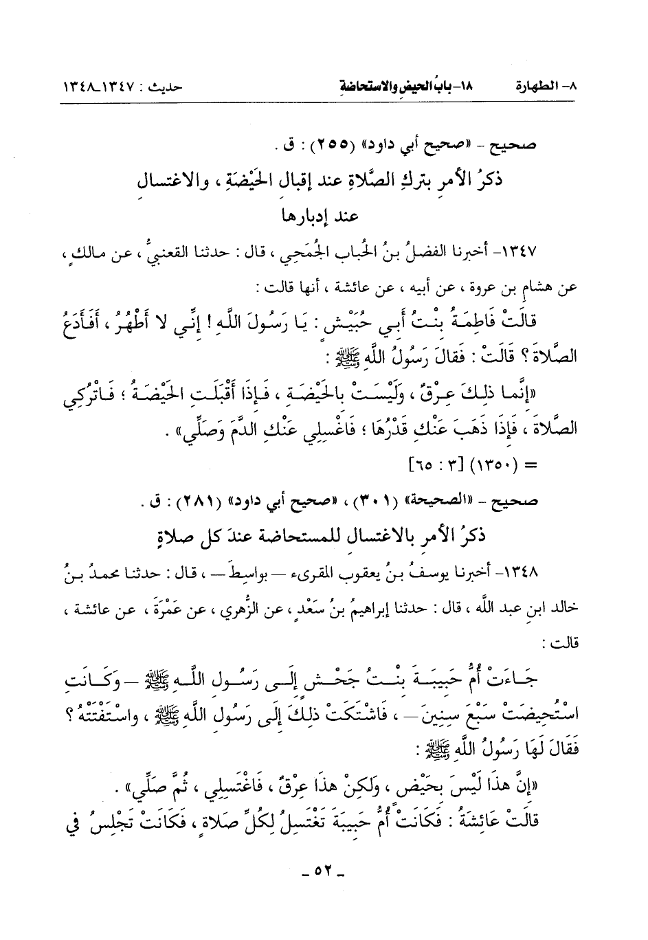 قَالَتْ عَائِشَةُ: فَكَانَتْ أُمُّ حَبِيبَةَ تَغْتَسِلُ لِكُلِّ صَلَاةٍ فَكَانَتْ تَجْلِسُ فِي -[53]- المِرْكَنِ فَيَعْلُو حُمْرَةُ الدم الماء ثم تصلي