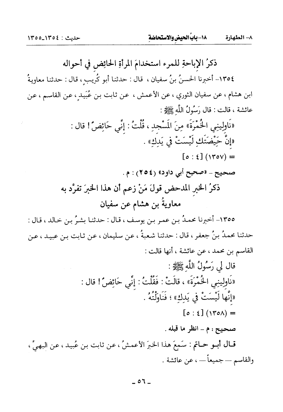 1355 - أَخْبَرَنَا مُحَمَّدُ بْنُ عُمَرَ بْنِ يُوسُفَ قَالَ: حَدَّثَنَا بِشْرُ بْنُ خَالِدٍ قَالَ: حَدَّثَنَا مُحَمَّدُ بْنُ جَعْفَرٍ قَالَ: حَدَّثَنَا شُعْبَةُ عَنْ سُلَيْمَانَ عَنْ ثَابِتِ بْنِ عُبَيْدٍ عَنِ الْقَاسِمِ بْنِ مُحَمَّدٍ: عَنْ عَائِشَةَ أَنَّهَا قَالَتْ: