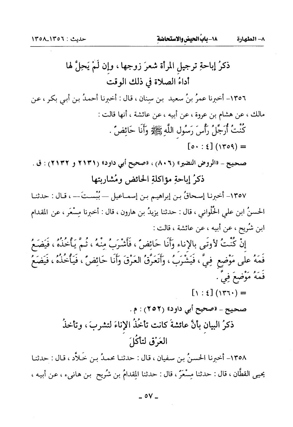 إِنْ كُنْتُ لَأُوتَى بِالْإِنَاءِ وَأَنَا حَائِضٌ فَأَشْرَبُ مِنْهُ ثُمَّ يَأْخُذُهُ فَيَضَعُ فَمَهُ عَلَى مَوْضِعِ فِيَّ فَيَشْرَبُ وأتَعَرَّقُ الْعَرْقَ وَأَنَا حائض فيأخذه فيضع فمه موضع فِيَّ
