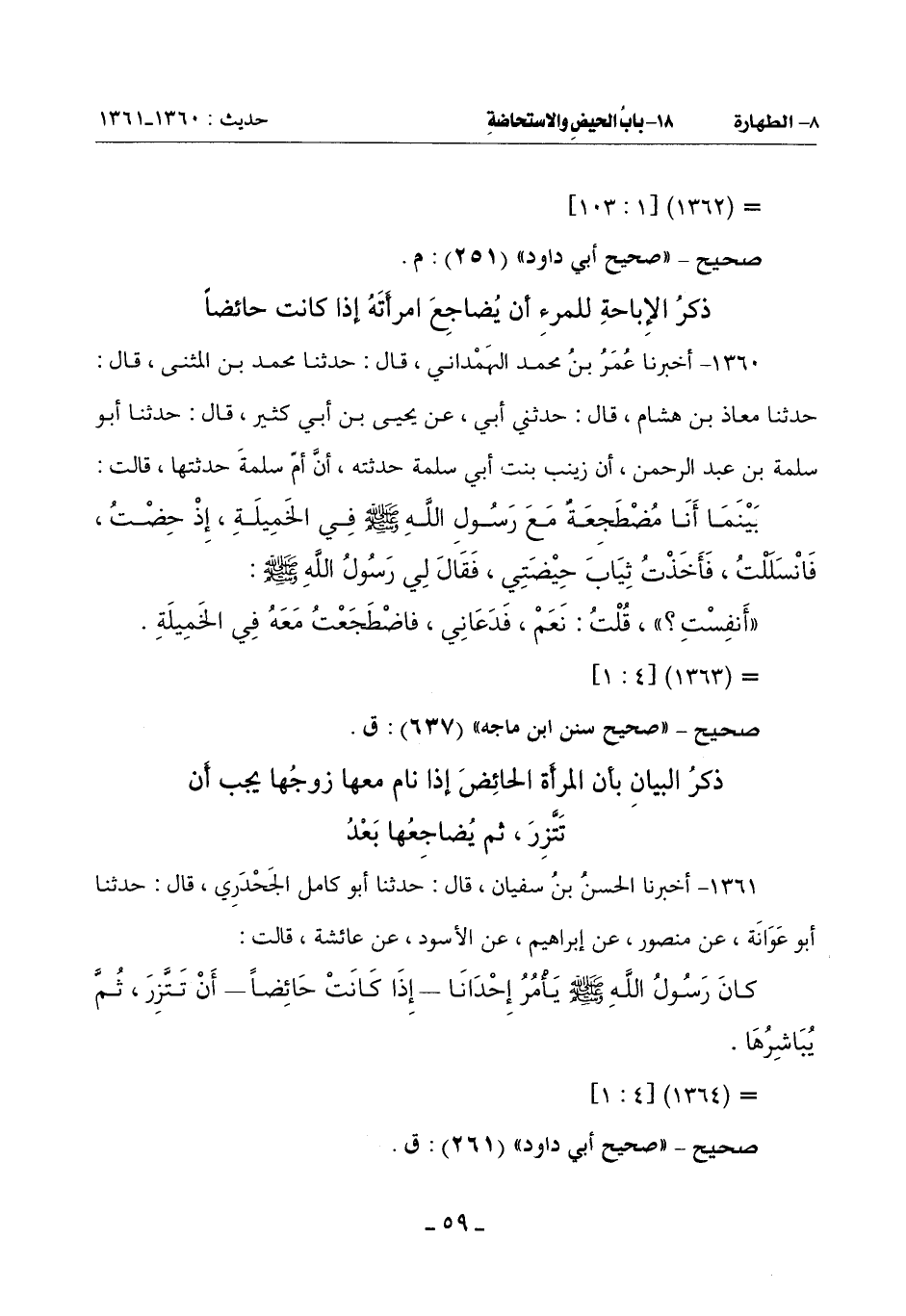 1361 - أَخْبَرَنَا الْحَسَنُ بْنُ سُفْيَانَ قَالَ: حَدَّثَنَا أَبُو كَامِلٍ الْجَحْدَرِيُّ قَالَ: حَدَّثَنَا أَبُو عَوَانَةَ عَنْ مَنْصُورٍ عَنْ إِبْرَاهِيمَ عَنِ الْأَسْوَدِ: عَنْ عَائِشَةَ قَالَتْ: