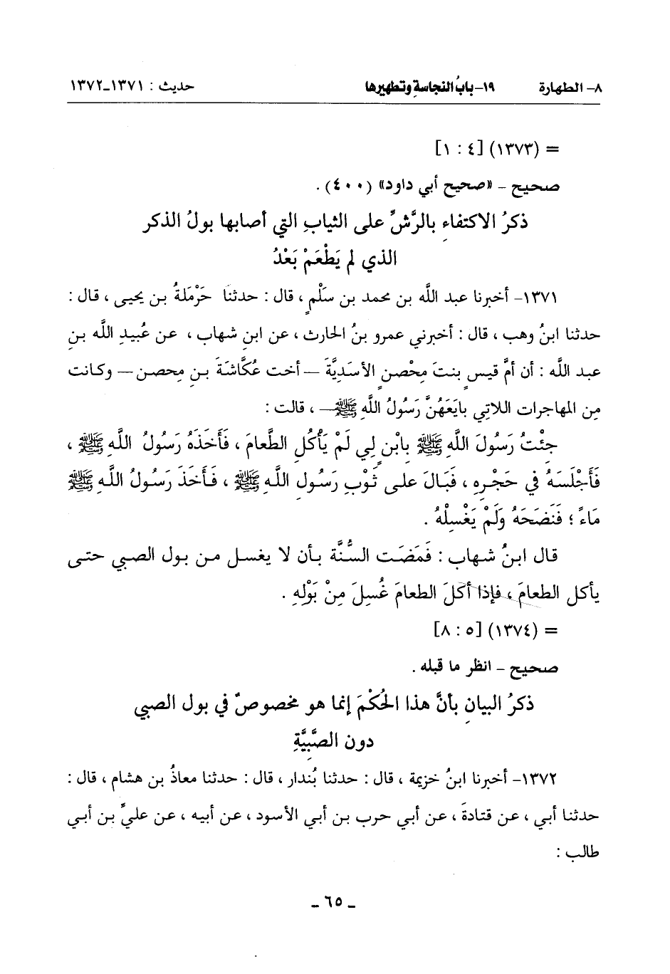 1371 - أَخْبَرَنَا عَبْدُ اللَّهِ بْنُ مُحَمَّدِ بْنِ سَلْمٍ قَالَ: حَدَّثَنَا حَرْمَلَةُ بْنُ يَحْيَى قَالَ: حَدَّثَنَا ابْنُ وَهْبٍ قَالَ: أَخْبَرَنِي عَمْرُو بْنُ الْحَارِثِ عَنِ ابْنِ شِهَابٍ عَنْ عُبَيْدِ اللَّهِ بْنِ عَبْدِ اللَّهِ: أَنَّ أُمَّ قَيْسٍ بِنْتَ مِحْصَنٍ الْأَسَدِيَّةَ أُخْتُ عُكَّاشَةَ بْنِ مِحْصَنٍ - وَكَانَتْ مِنَ المهاجرات اللاتي بَايَعَهُنَّ رَسُولُ اللَّهِ صَلَّى اللَّهُ عَلَيْهِ وَسَلَّمَ - قَالَتْ: