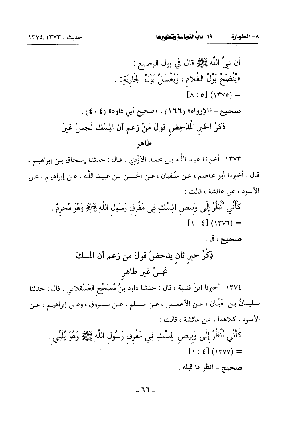 1374 - أخبرنا ابن قتيبة قال: حدثنا داود مُصَحِّحٍ الْعَسْقَلَانِيُّ قَالَ حَدَّثَنَا سُلَيْمَانُ بْنُ حَيَّانَ عَنِ الْأَعْمَشِ عَنْ مُسْلِمٍ عَنْ مَسْرُوقٍ وَعَنْ إبراهيم عن الأسود كلاهما: عَنْ عَائِشَةَ قَالَتْ:
