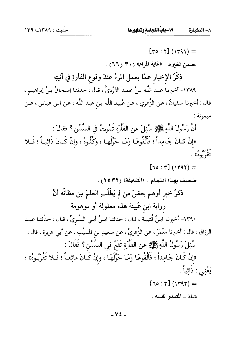 سُئِلَ رَسُولُ اللَّهِ صَلَّى اللَّهُ عَلَيْهِ وَسَلَّمَ عَنِ الْفَأْرَةِ تَقَعُ فِي السَّمْنِ فَقَالَ:.