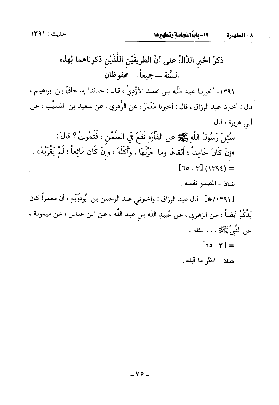 1391 - أَخْبَرَنَا عَبْدُ اللَّهِ بْنُ مُحَمَّدٍ الْأَزْدِيُّ قَالَ: حَدَّثَنَا إِسْحَاقُ بْنُ إِبْرَاهِيمَ قَالَ: أَخْبَرَنَا عَبْدُ الرَّزَّاقِ قَالَ: أَخْبَرَنَا مَعْمَرٌ عَنِ الزُّهْرِيِّ عَنْ سَعِيدِ بْنِ الْمُسَيِّبِ: عَنْ أَبِي هُرَيْرَةَ قَالَ: