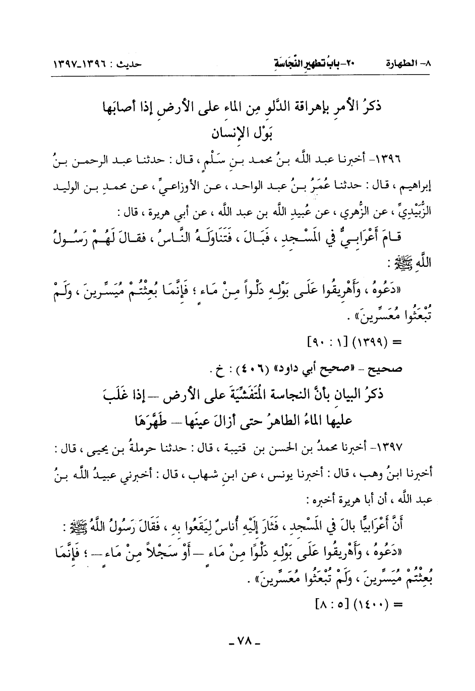 (دَعُوهُ وَأَهْرِيقُوا عَلَى بَوْلِهِ دَلْوًا مِنْ مَاءٍ أَوْ سَجْلاَ مِنْ مَاءٍ فَإِنَّمَا بُعِثْتُمْ مُيَسِّرِينَ ولم تبعثوا معسرين)