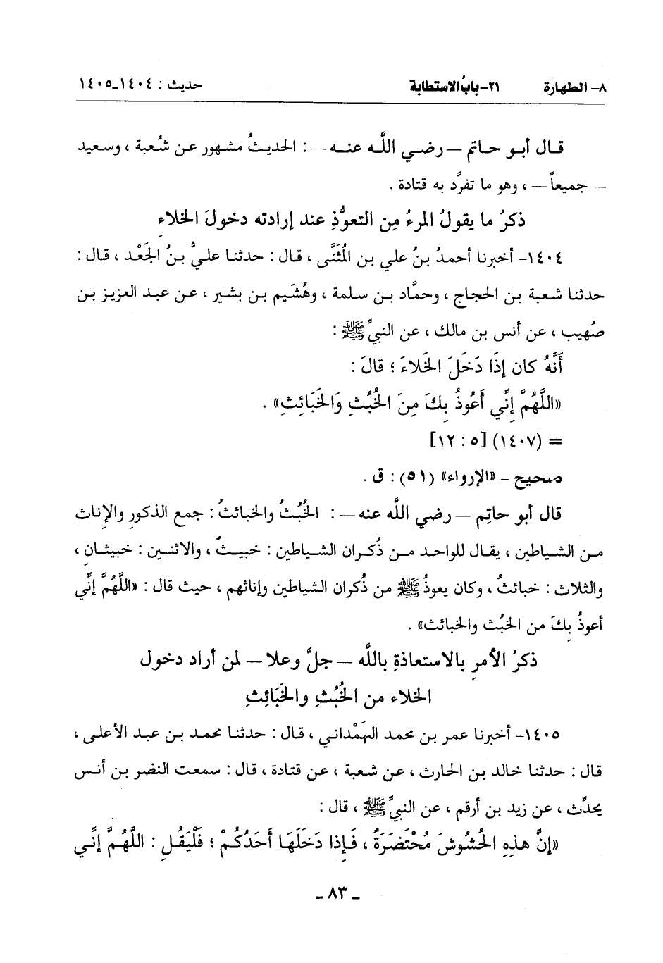 قال أبو حاتم رضي الله عنه: الخُبُثُ وَالْخَبَائِثِ: جَمْعُ الذُّكُورِ وَالْإِنَاثِ مِنَ الشَّيَاطِينِ يُقَالُ لِلْوَاحِدِ مِنْ ذُكْرَانِ الشَّيَاطِينِ خَبِيثٌ وَالِاثْنَيْنِ خَبِيثَانِ وَالثَّلَاثُ خَبَائِثِ وَكَانَ يَعُوذُ صَلَّى اللَّهُ عَلَيْهِ وَسَلَّمَ مِنْ ذُكْرَانٍ الشَّيَاطِينِ وَإِنَاثِهِمْ حَيْثُ قَالَ: (اللَّهُمَّ إِنِّي أَعُوذُ بِكَ مِنَ الْخُبُثِ وَالْخَبَائِثِ)