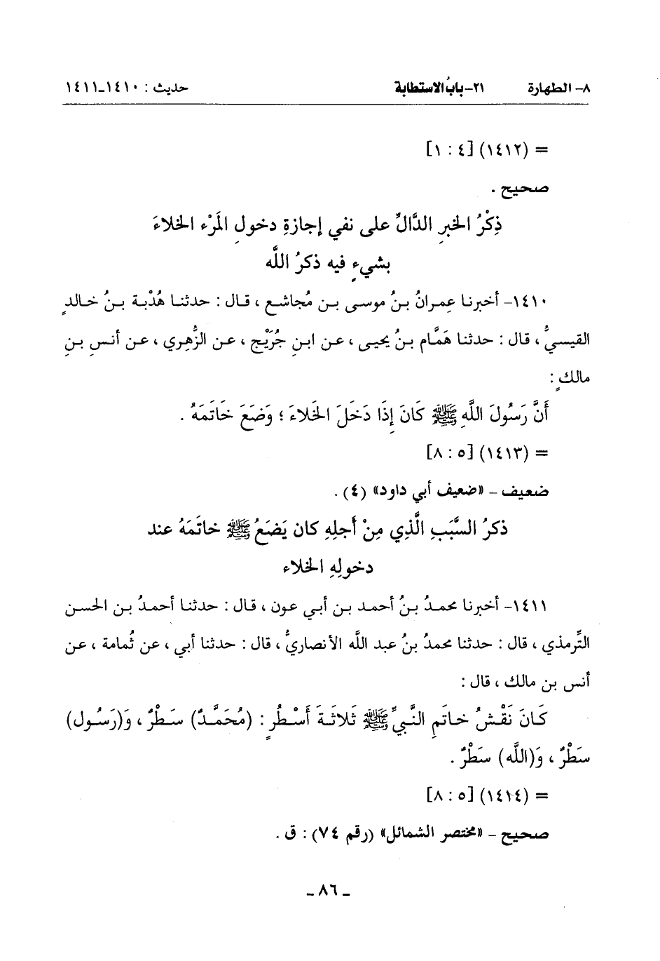 1410 - أَخْبَرَنَا عِمْرَانُ بْنُ مُوسَى بْنِ مُجَاشِعٍ قَالَ: حَدَّثَنَا هُدْبَةُ بْنُ خَالِدٍ الْقَيْسِيُّ قَالَ: حَدَّثَنَا هَمَّامُ بْنُ يَحْيَى عَنِ ابْنِ جُرَيْجٍ عَنِ الزُّهْرِيِّ عَنْ أَنَسِ بْنِ مَالِكٍ:
