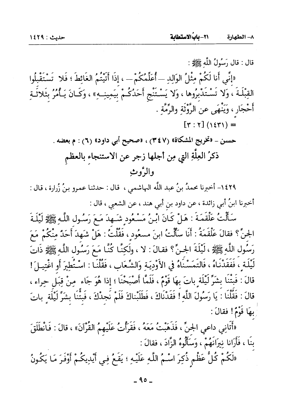 (فَلَا تَسْتَنْجُوا بِالْعَظْمِ وَلَا بِالْبَعْرِ فَإِنَّهُ زَادُ إِخْوَانِكُمْ مِنَ الجن)