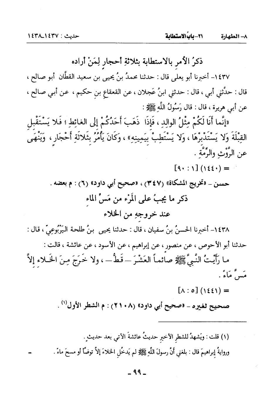 1438 - أَخْبَرَنَا الْحَسَنُ بْنُ سُفْيَانَ قَالَ: حَدَّثَنَا يَحْيَى بْنُ طَلْحَةَ الْيَرْبُوعِيُّ قَالَ: حَدَّثَنَا أَبُو الْأَحْوَصِ عَنْ مَنْصُورٍ عَنْ إِبْرَاهِيمَ عَنِ الْأَسْوَدِ عَنْ عَائِشَةَ قَالَتْ: