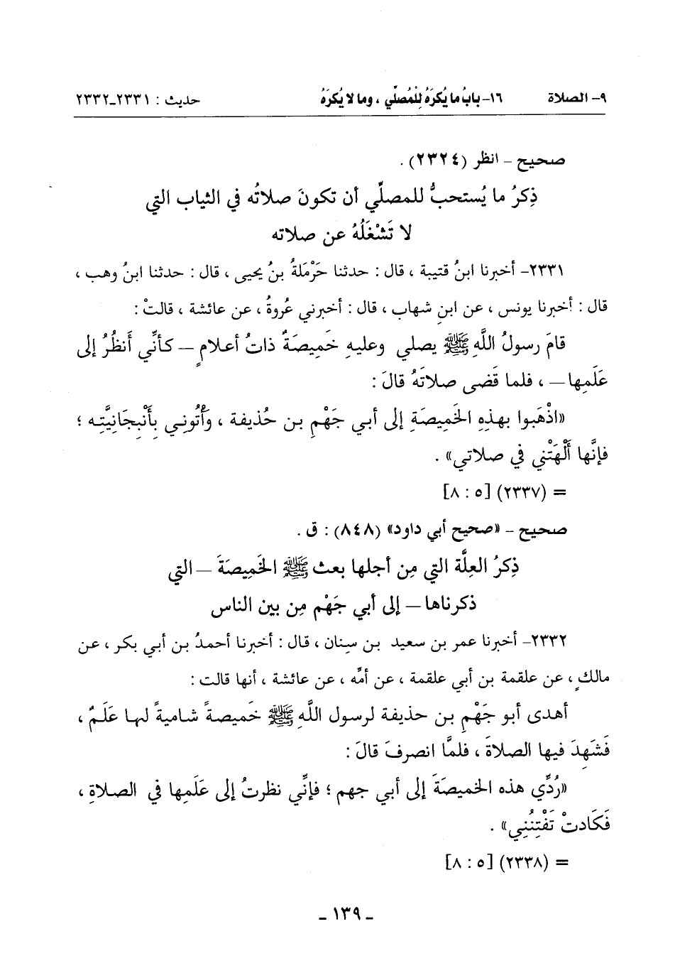 (اذْهَبُوا بِهَذِهِ الْخَمِيصَةِ إِلَى أَبِي جَهْمِ بْنِ حُذَيْفَةَ وَائْتُونِي بأنبِجَانِيَّتِه فإنَّها أَلْهَتْني في صلاتي)