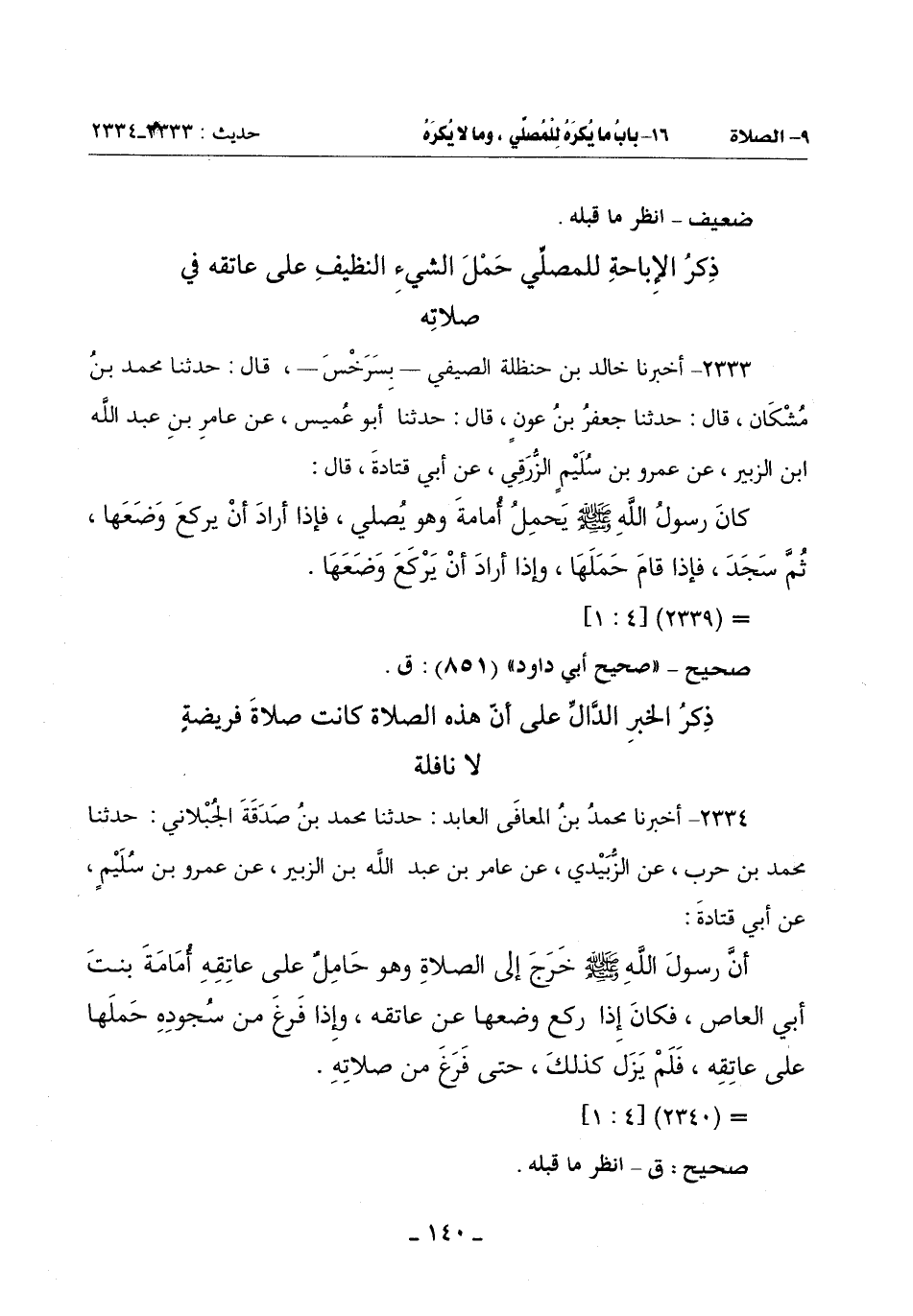 ذِكْرُ الْإِبَاحَةِ لِلْمُصَلِّي حَمْلَ الشَّيْءِ النَّظِيفِ عَلَى عَاتِقِهِ فِي صَلَاتِهِ