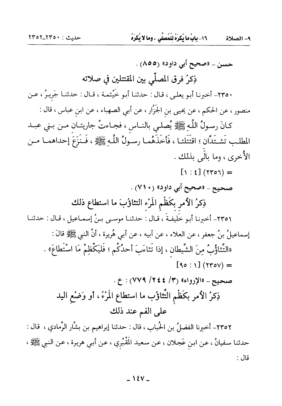 -[148]- (إِنَّ اللَّهَ يُحِبُّ الْعُطَاسَ وَيَكْرَهُ التَّثَاؤُبَ فَإِذَا تَثَاءَبَ أَحَدُكُمْ فَلْيَكْظِمْ مَا اسْتَطَاعَ أَوْ لِيَضَعَ يَدَهُ عَلَى فِيهِ فَإِنَّهُ إِذَا تَثَاءَبَ فَقَالَ: آهْ فَإِنَّمَا هُوَ الشَّيْطَانُ يَضْحَكُ مِنْ جوفه)