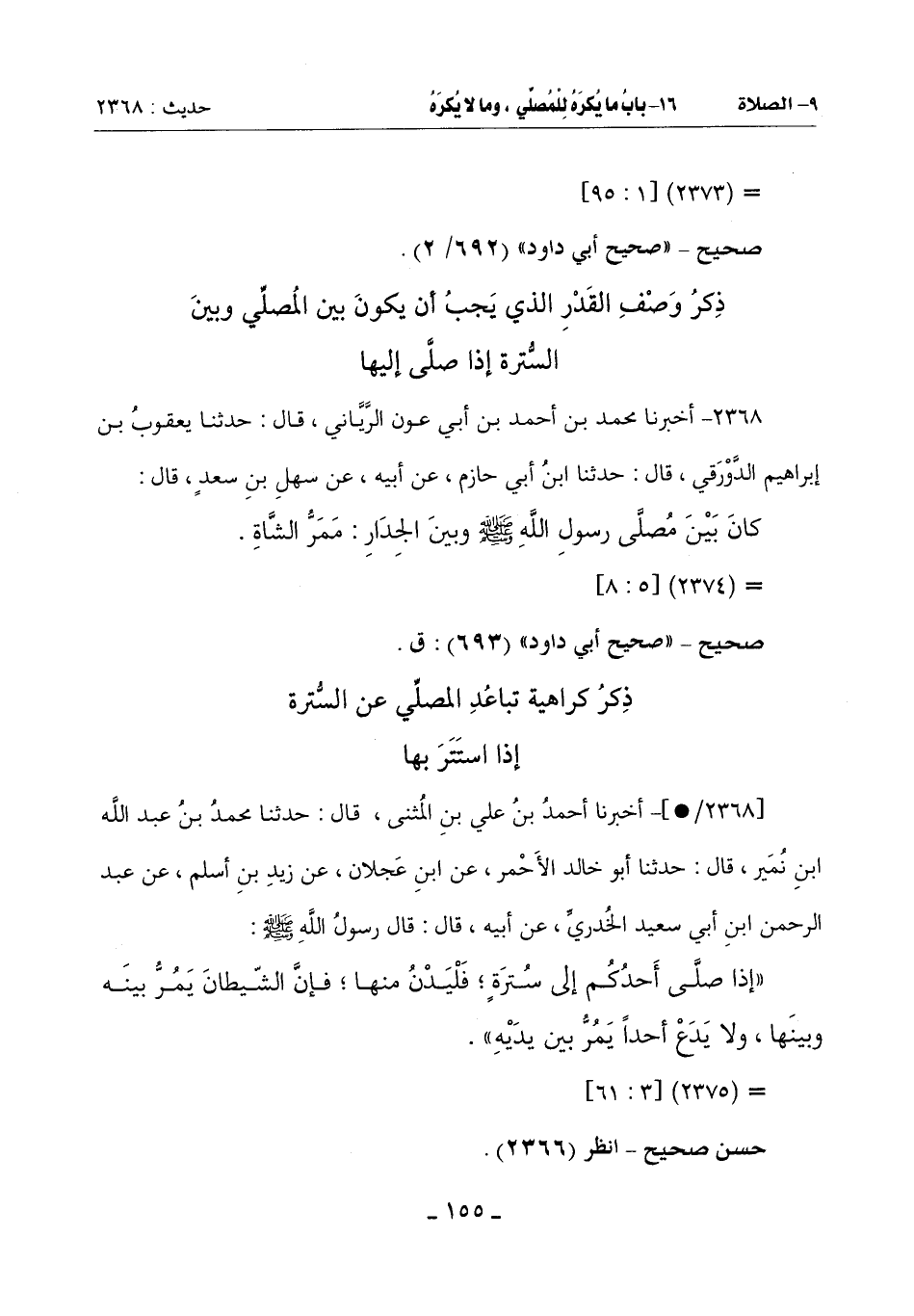(إِذَا صَلَّى أَحَدُكُمْ إِلَى سُتْرَةٍ فَلْيَدْنُ مِنْهَا فَإِنَّ الشَّيْطَانَ يَمُرُّ بَيْنَهُ وَبَيْنَهَا ولا يدع أحدا يمر بين يديه)