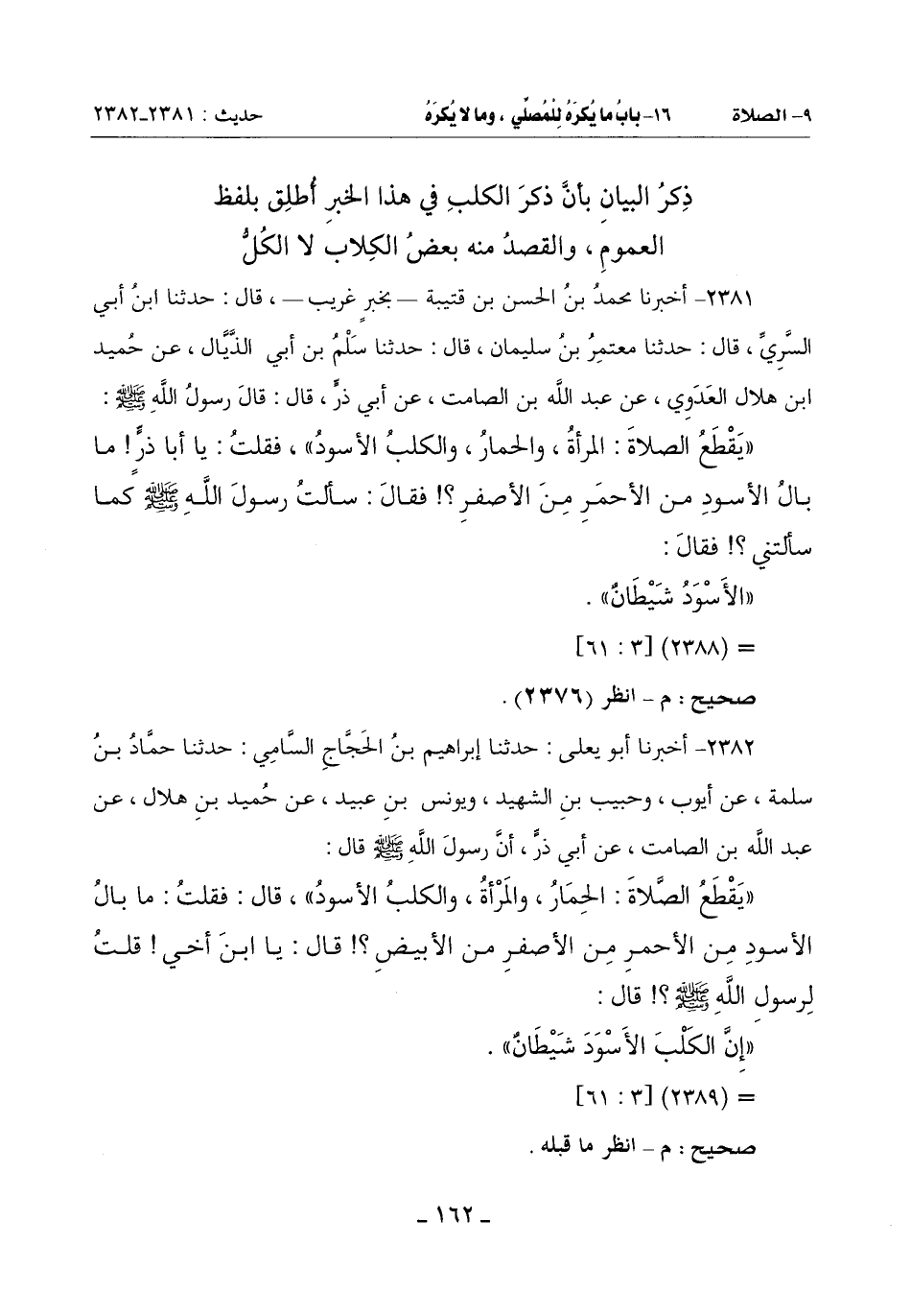 (يَقْطَعُ الصَّلَاةَ الْمَرْأَةُ وَالْحِمَارُ وَالْكَلْبُ الْأَسْوَدُ) فَقُلْتُ: يَا أَبَا ذَرٍّ مَا بَالُ الْأَسْوَدِ مِنَ الْأَحْمَرِ مِنَ الْأَصْفَرِ؟ فَقَالَ: سَأَلْتُ رَسُولَ اللَّهِ صَلَّى اللَّهُ عَلَيْهِ وَسَلَّمَ كَمَا سألتني فقال: