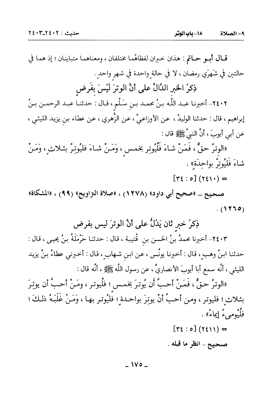 (الْوِتْرُ حَقٌّ فَمَنْ شَاءَ فَلْيُوتِرْ بِخَمْسٍ وَمَنْ شَاءَ فَلْيُوتِرْ بِثَلَاثٍ وَمَنْ شَاءَ فَلْيُوتِرْ بِوَاحِدَةٍ)
