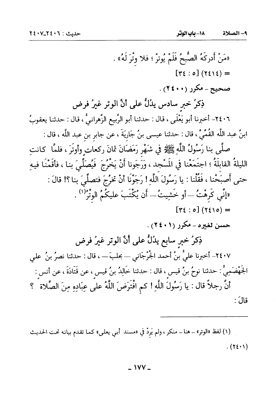 (¬1) لفظ ((الوتر)) ـ هنا ـ منكر، ولم يَرِدْ في ((مسند أبي يعلى)) كما تقدم بيانه تحت الحديث (2401).