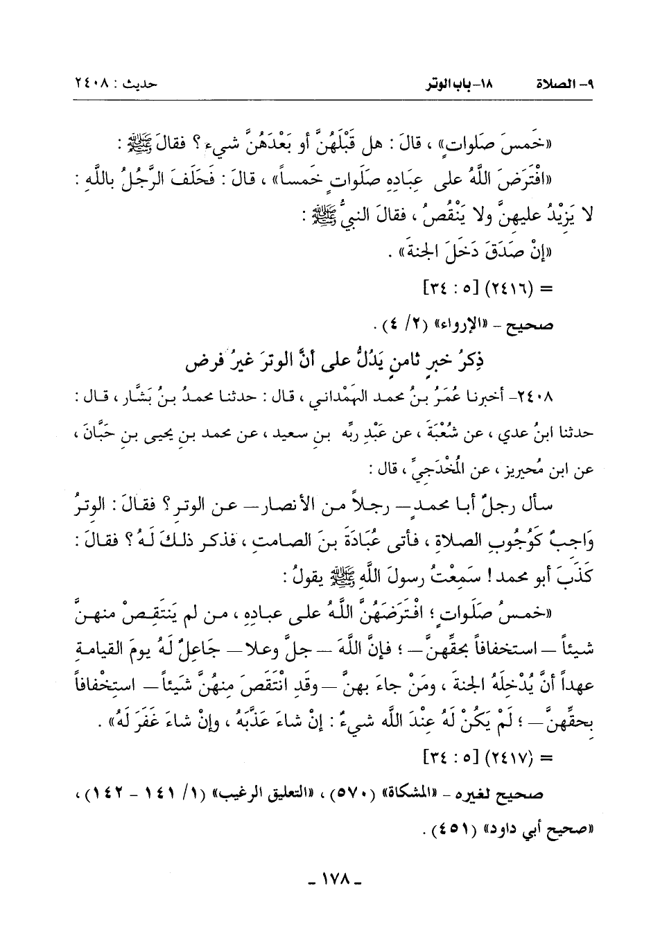 (خَمْسُ صَلَوَاتٍ افْتَرَضَهُنَّ اللَّهُ عَلَى عِبَادِهِ مَنْ لَمْ يَنْتَقِصْ مِنْهُنَّ شَيْئًا ـ اسْتِخْفَافًا بحقِّهنَّ ـ فَإِنَّ اللَّهَ جَلَّ وَعَلَا جَاعِلٌ لَهُ يَوْمَ الْقِيَامَةِ عَهْدًا أَنْ يُدْخِلَهُ الْجَنَّةَ وَمَنْ جَاءَ بِهِنَّ ـ وَقَدِ انْتَقَصَ منهنَّ شَيْئًا ـ اسْتِخْفَافًا بحقِّهنَّ ـ لَمْ يَكُنْ لَهُ عِنْدَ اللَّهِ شَيْءٌ إِنْ شَاءَ عَذَّبَهُ وَإِنْ شَاءَ غفر له)
