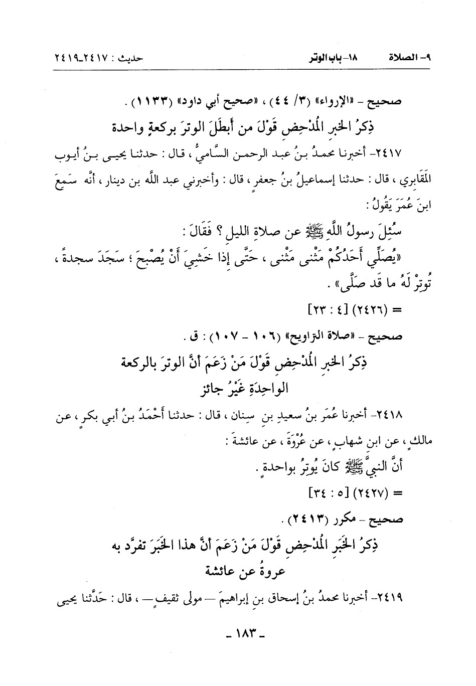 ذِكْرُ الْخَبَرِ الْمُدْحِضِ قَوْلَ مَنْ أَبْطَلَ الْوِتْرَ بركعة واحدة