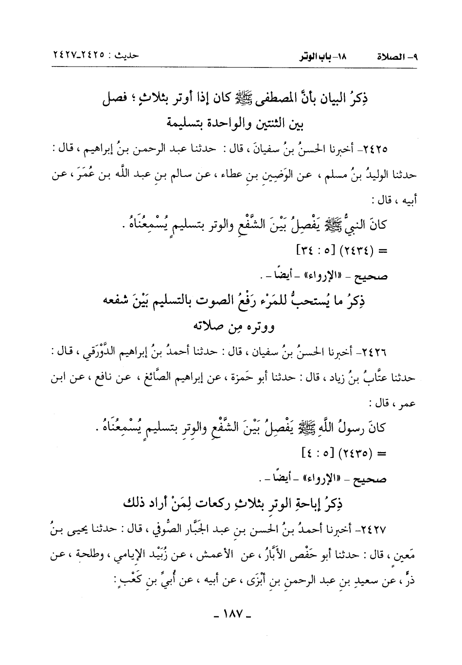 كَانَ النَّبِيُّ صَلَّى اللَّهُ عَلَيْهِ وَسَلَّمَ يفصل بين الشفع والوتر بتسليم يُسْمِعُنَاهُ