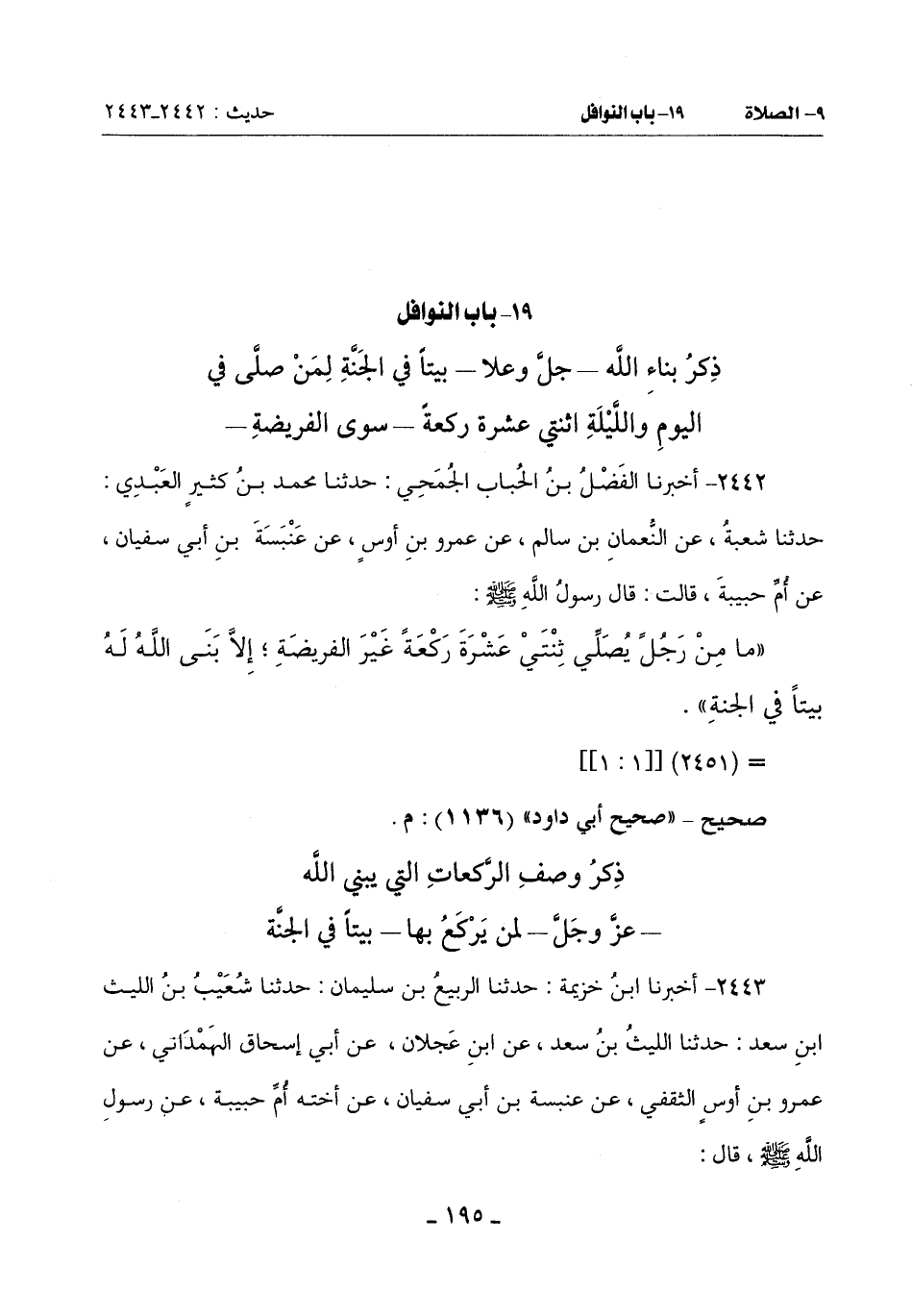 ذِكْرُ وَصْفِ الرَّكَعَاتِ الَّتِي يَبْنِي اللَّهُ ـ عَزَّ وَجَلَّ ـ لِمَنْ يَرْكَعُ بِهَا ـ بَيْتًا فِي الْجَنَّةِ