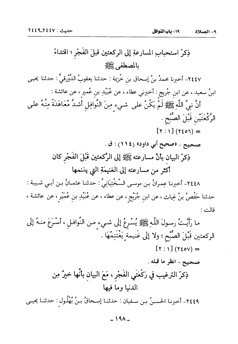 ذِكْرُ الْبَيَانِ بِأَنَّ مُسَارَعَتَهُ صَلَّى اللَّهُ عَلَيْهِ وَسَلَّمَ إِلَى الرَّكْعَتَيْنِ قَبْلَ الْفَجْرِ كَانَ أَكْثَرَ مِنْ مُسَارَعَتِهِ إِلَى الْغَنِيمَةِ الَّتِي يَغْنَمُهَا