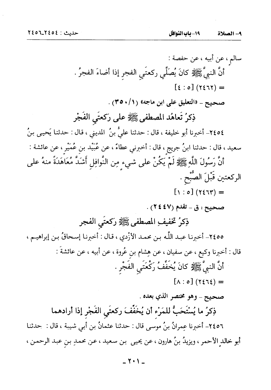 ذِكْرُ تَخْفِيفِ الْمُصْطَفَى صَلَّى اللَّهُ عَلَيْهِ وَسَلَّمَ ركعتي الفجر