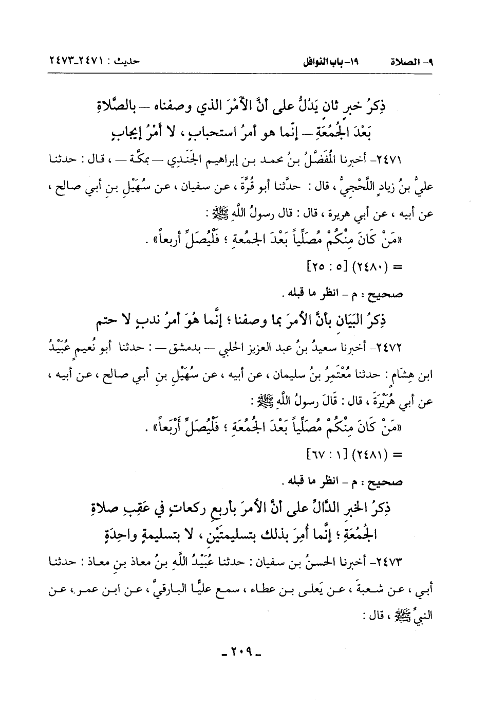 ذِكْرُ خَبَرٍ ثَانٍ يَدُلُّ عَلَى أَنَّ الْأَمْرَ الَّذِي وَصَفْنَاهُ ـ بِالصَّلَاةِ بَعْدَ الْجُمُعَةِ ـ إِنَّمَا هُوَ أَمْرُ اسْتِحْبَابٍ لَا أَمْرُ إِيجَابٍ