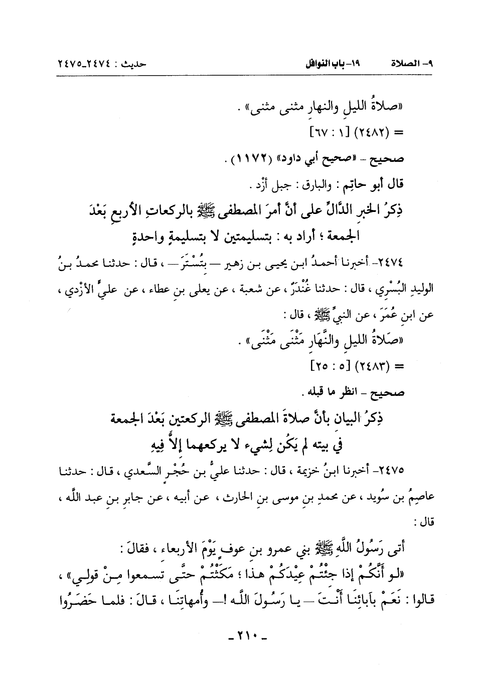 2475 - أَخْبَرَنَا ابْنُ خُزَيْمَةَ قَالَ: حَدَّثَنَا عَلِيُّ بْنُ جحر السَّعْدِيُّ قَالَ: حَدَّثَنَا عَاصِمُ بْنُ سُوَيْدٍ عَنْ مُحَمَّدِ بْنِ مُوسَى بْنِ الْحَارِثِ عَنْ أَبِيهِ عَنْ جَابِرِ بْنِ عَبْدِ اللَّهِ قَالَ: