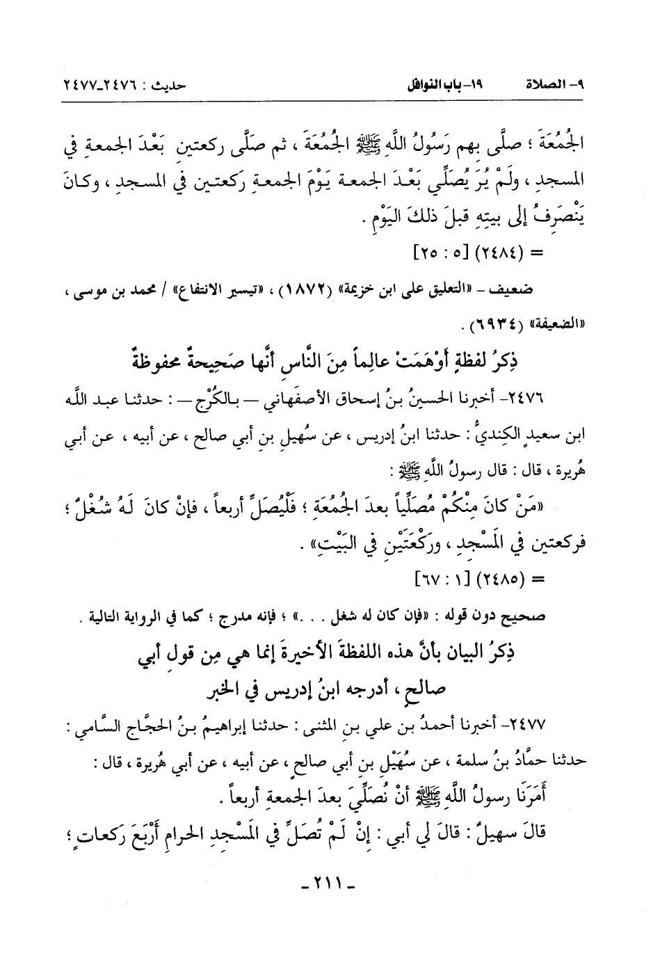 (مَنْ كَانَ مِنْكُمْ مُصَلِّياً بَعْدَ الْجُمُعَةِ فَلْيُصَلِّ أَرْبَعًا فَإِنْ كَانَ لَهُ شُغْلٌ فَرَكْعَتَيْنِ فِي الْمَسْجِدِ وَرَكْعَتَيْنِ في البيت)