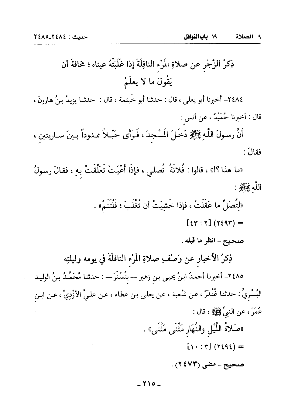2484 - أَخْبَرَنَا أَبُو يَعْلَى قَالَ: حَدَّثَنَا أَبُو خَيْثَمَةَ قَالَ: حَدَّثَنَا يَزِيدُ بْنُ هَارُونَ قَالَ: أَخْبَرَنَا حُمَيْدٌ عَنْ أَنَسٍ: