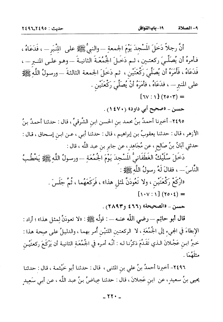 قَالَ أَبُو حَاتِمٍ ـ رَضِيَ اللَّهُ عَنْهُ ـ: قَوْلُهُ صَلَّى اللَّهُ عَلَيْهِ وَسَلَّمَ: (لَا تعودَنَّ لِمِثْلِ هَذَا) أَرَادَ الْإِبْطَاءَ فِي الْمَجِيءِ إِلَى الْجُمُعَةِ لَا الرَّكْعَتَيْنِ اللَّتَيْنِ أُمر بِهِمَا وَالدَّلِيلُ عَلَى صِحَّةِ هَذَا خَبَرُ ابْنِ عَجْلَانَ الَّذِي تَقَدَّمَ ذِكْرُنَا لَهُ أَنَّهُ أَمَرَهُ فِي الْجُمُعَةِ الثَّانِيَةِ أَنْ يَرْكَعَ رَكْعَتَيْنِ مِثْلَهُمَا