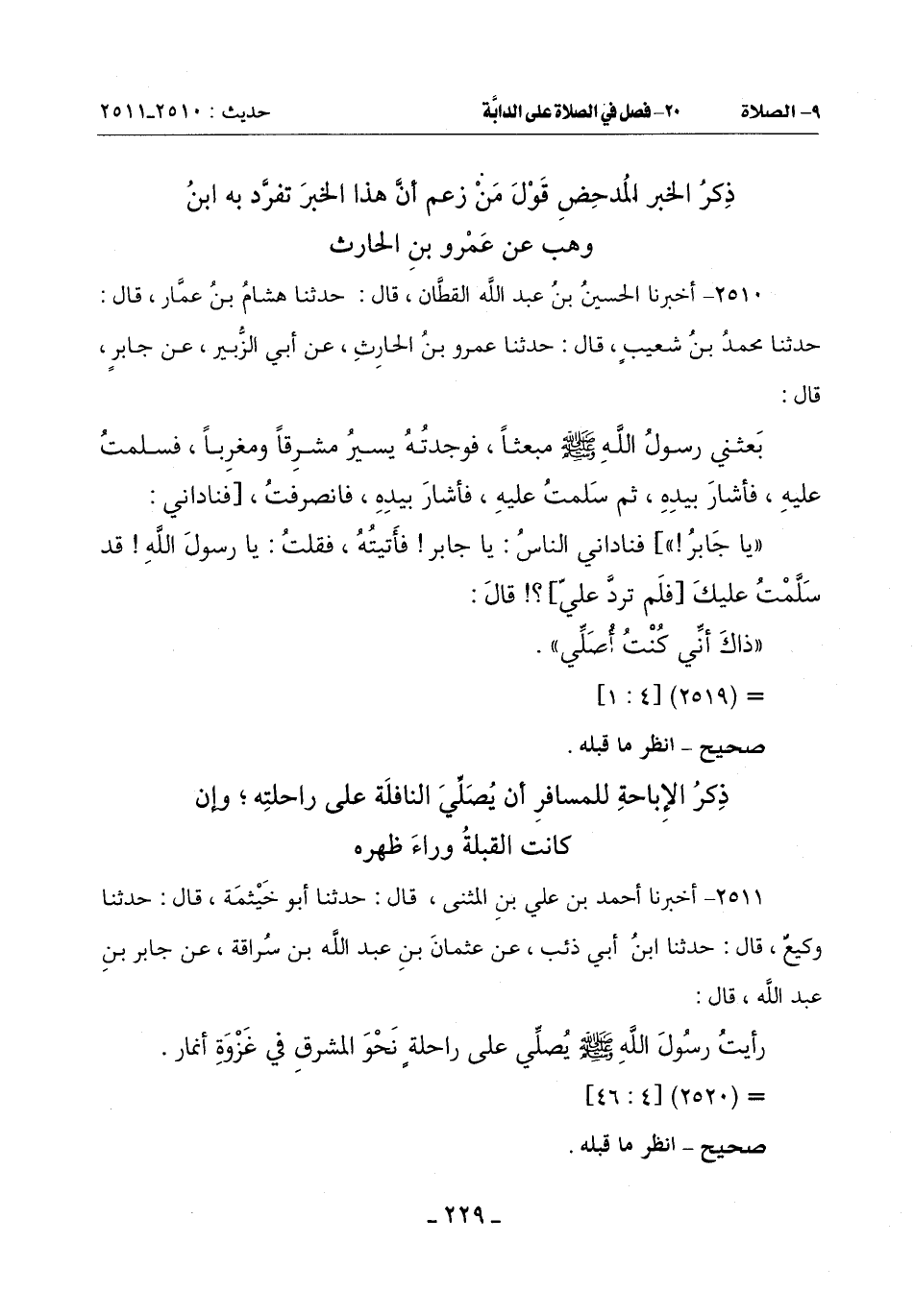 2511 - أَخْبَرَنَا أَحْمَدُ بْنُ عَلِيِّ بْنِ الْمُثَنَّى قَالَ: حَدَّثَنَا أَبُو خَيْثَمَةَ قَالَ: حَدَّثَنَا وَكِيعٌ قَالَ: حَدَّثَنَا ابْنُ أَبِي ذِئْبٍ عَنْ عُثْمَانَ بْنِ عَبْدِ اللَّهِ بْنِ سُرَاقَةَ عَنْ جَابِرِ بْنِ عَبْدِ اللَّهِ قَالَ: