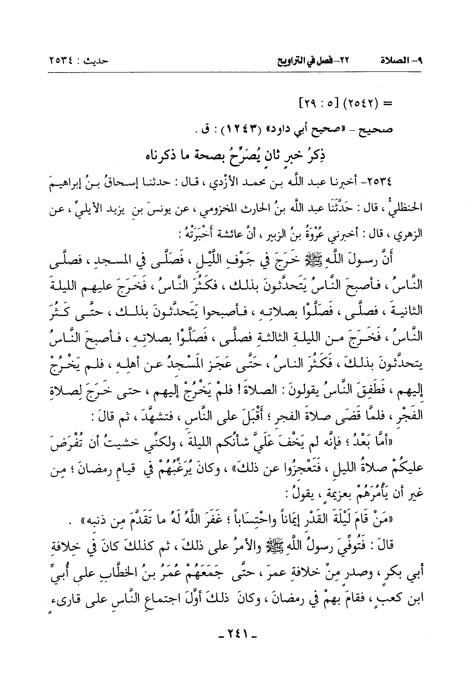 (أَمَّا بَعْدُ فَإِنَّهُ لَمْ يَخْفَ عَلَيَّ شَأْنُكُمُ اللَّيْلَةَ وَلَكِنِّي خَشِيتُ أَنْ تُفْرَضَ عَلَيْكُمْ صَلَاةُ اللَّيْلِ فَتَعْجِزُوا عَنْ ذَلِكَ وَكَانَ يُرَغِّبُهُمْ فِي قِيَامِ رَمَضَانَ مِنْ غَيْرِ أَنْ يَأْمُرَهُمْ بِعَزِيمَةٍ يَقُولُ: