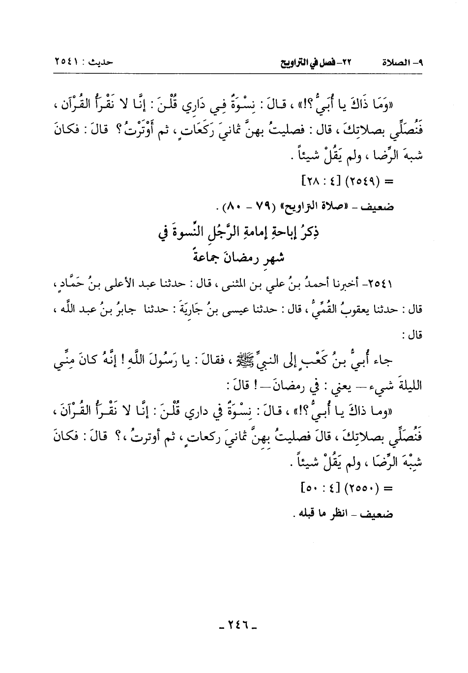 وَمَا ذَاكَ يَا أُبيُّ؟ قَالَ: نسوةٌ فِي دَارِي قُلْنَ: إِنَّا لَا نَقْرَأُ الْقُرْآنَ فَنُصَلِّي بِصَلَاتِكَ قَالَ فَصَلَّيْتُ بِهِنَّ ثَمَانِيَ رَكَعَاتٍ ثُمَّ أَوْتَرْتُ قَالَ: فَكَانَ شِبْهَ الرِّضَا وَلَمْ يَقُلْ شيئاً