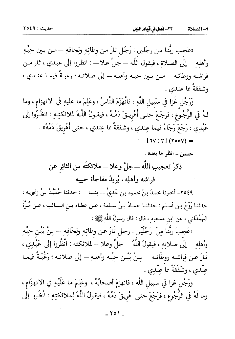 (عَجِبَ رَبُّنَا مِنْ رَجُلَيْنِ: رَجُلٍ ثَارَ عَنْ وِطَائِهِ وَلِحَافِهِ مِنْ بَيْنَ حِبِّهِ وَأَهْلِهِ إِلَى صَلَاتِهِ فَيَقُولُ اللَّهُ جَلَّ وَعَلَا لِمَلَائِكَتِهِ: انْظُرُوا إِلَى عَبْدِي ثَارَ عَنْ فِرَاشِهِ وَوِطَائِهِ مِنْ بَيْنَ حِبِّهِ وَأَهْلِهِ إِلَى صَلَاتِهِ رَغْبَةً فِيمَا عِنْدِي وَشَفَقَةً مِمَّا عِنْدِي