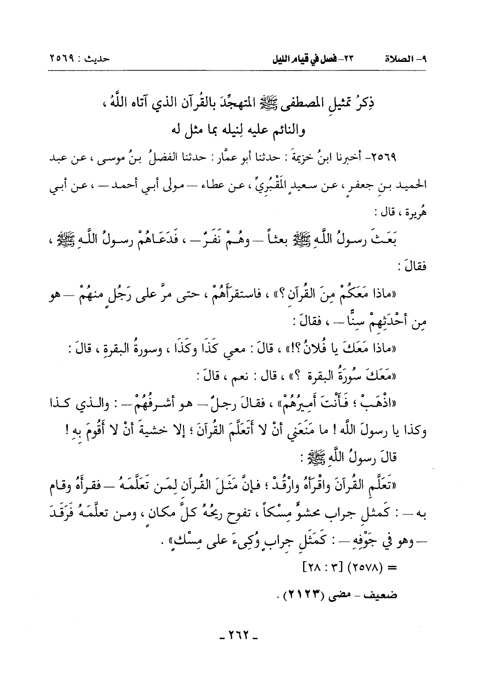 (تَعَلَّمِ الْقُرْآنَ وَاقْرَأْهُ وَارْقُدْ فَإِنَّ مَثَلَ الْقُرْآنِ لِمَنْ تَعَلَّمَهُ فَقَرَأَهُ وَقَامَ بِهِ كَمَثَلِ جِرَابٍ مَحْشُوٍّ مِسْكًا تَفُوحُ رِيحُهُ كُلِّ مَكَانٍ وَمَنْ تَعَلَّمَهُ فَرْقَدَ وَهُوَ فِي جوفه كمثل جراب وُكِىءَ على مسك)